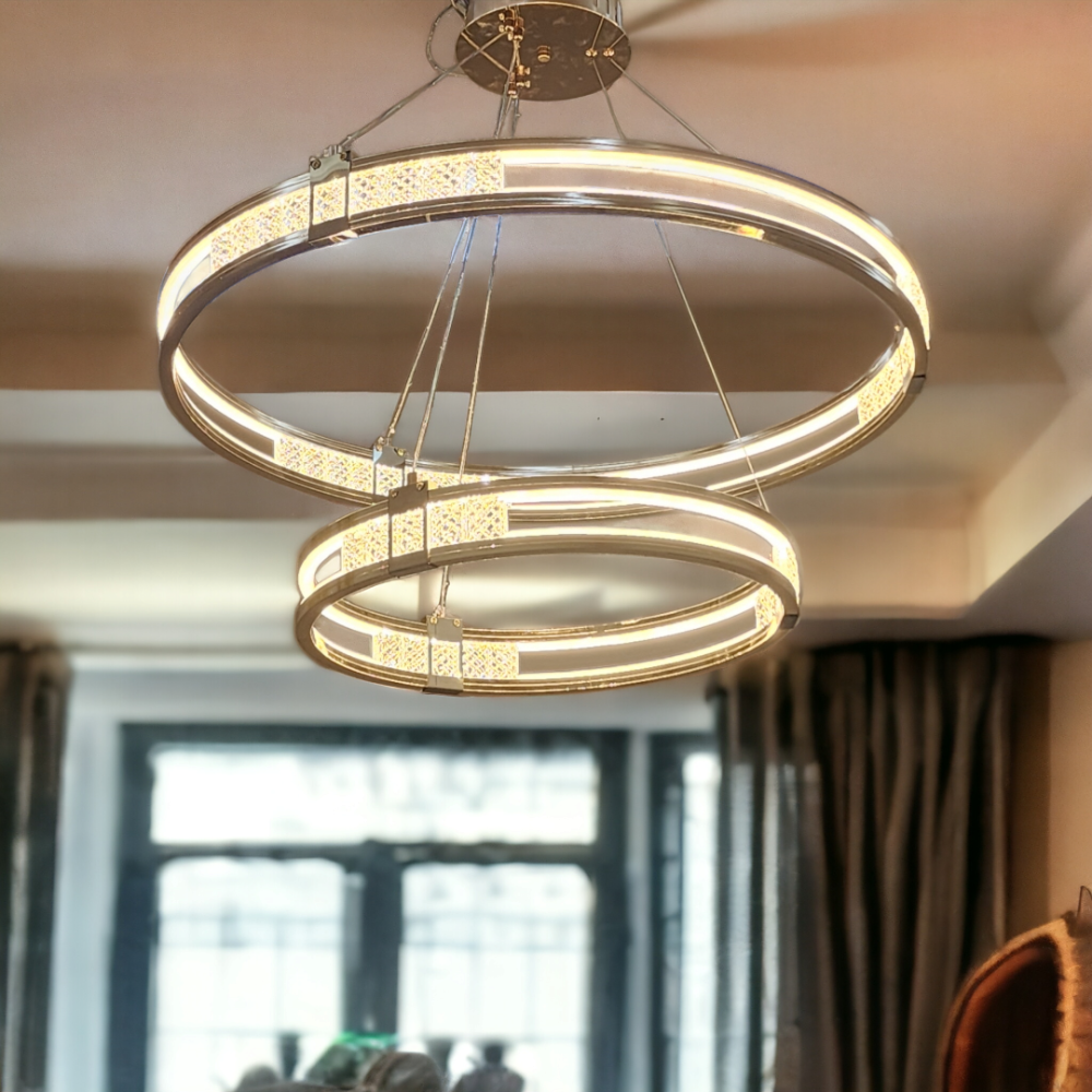 ثريا ليد كريستال دورين مع 3 إنارات تعتبر إضافة أنيقة وعصرية لأي غرفة في المنزل. تتميز هذه الثريا بتصميم فريد يجمع بين الكريستال اللامع والإضاءة الحديثة، مما يضفي جواً من الفخامة والرقي.