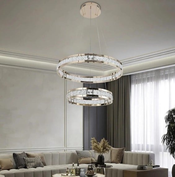 · الثريا (Chandelier): قطع مركزية أنيقة، مناسبة لغرف ذات أسقف مرتفعة. تضيف فخامة وتعمل كعنصر ديكور رئيسي.